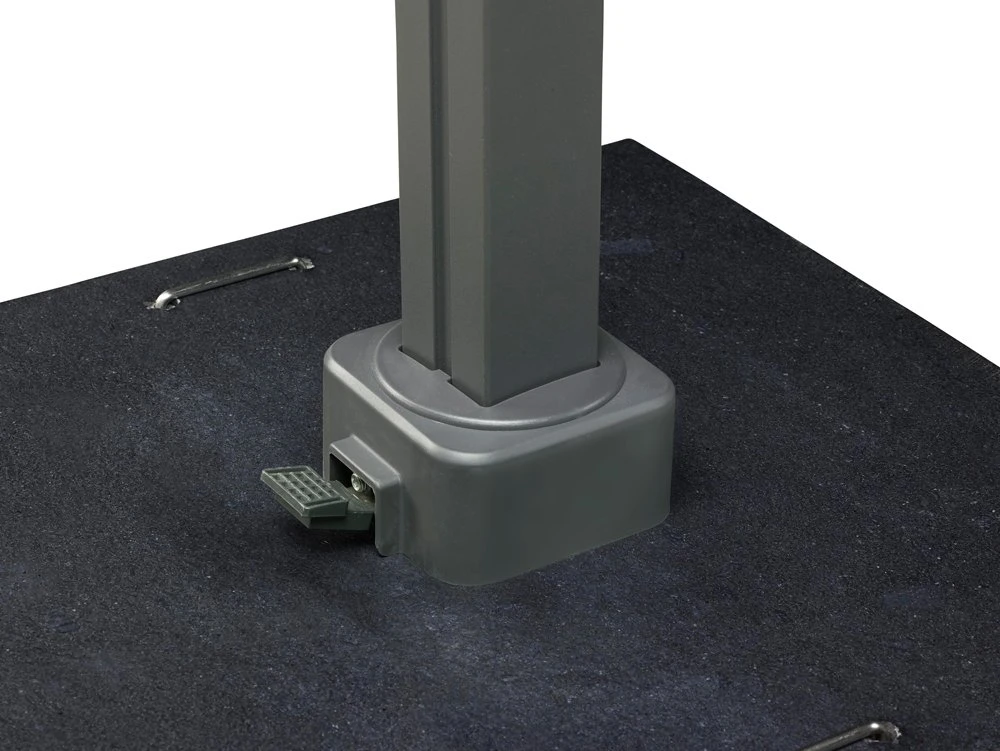 De parasol wordt zonder voet geleverd. Wij adviseren deze parasol op een Platinum Modena 150kg parasolvoet te plaatsen (art nr. 6086). Deze is uitgevoerd met zwenkwielen zodat de parasol makkelijk te verplaatsen is. Platinum biedt ook een ingraaf parasolvoet XL (art.nr. 6905). De ingraaf parasolvoet is geheel verwerkt in de grond. Hierdoor heeft u meer ruimte op uw terras. De ingraafvoet is makkelijk te plaatsen zonder gebruik van beton.